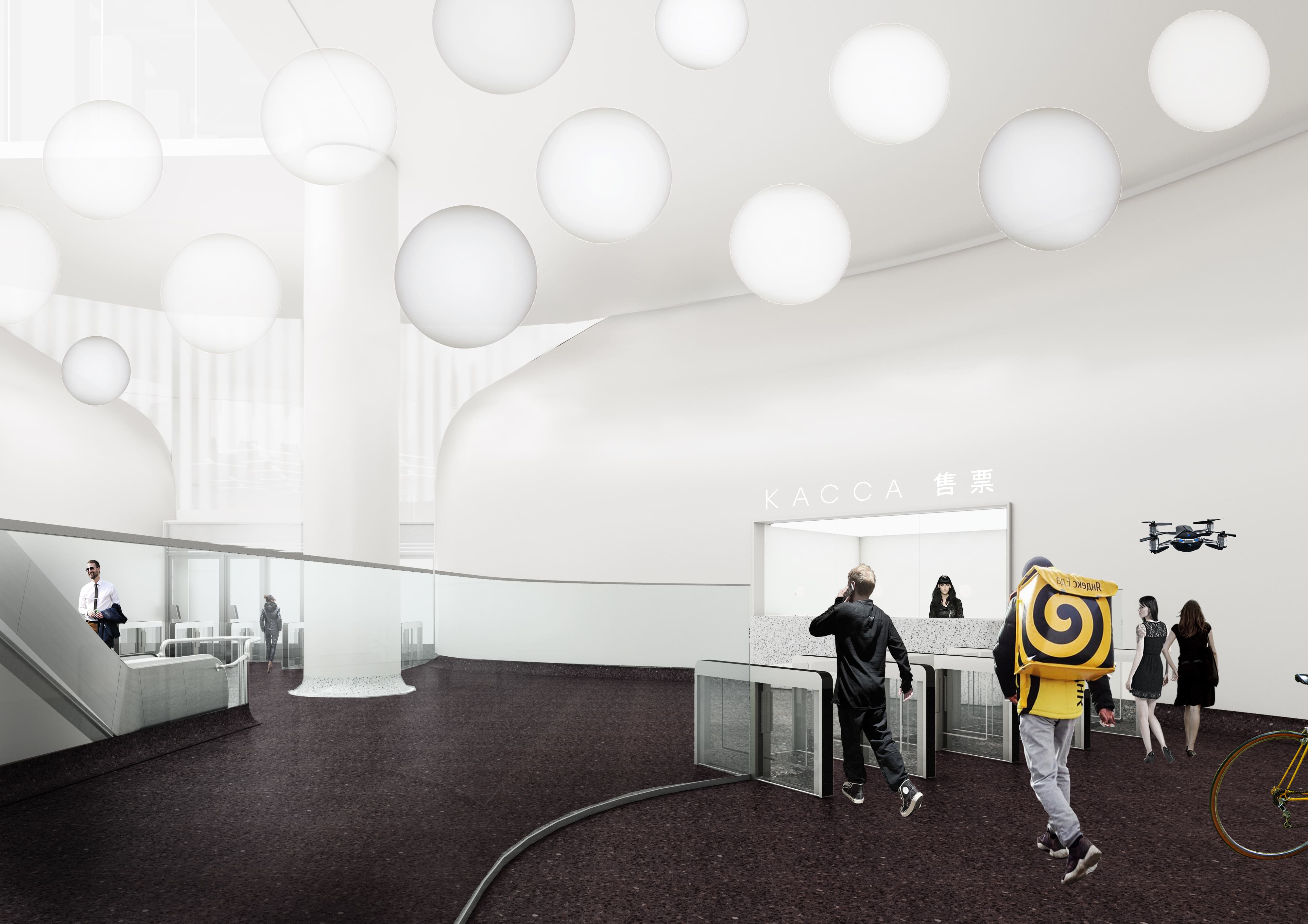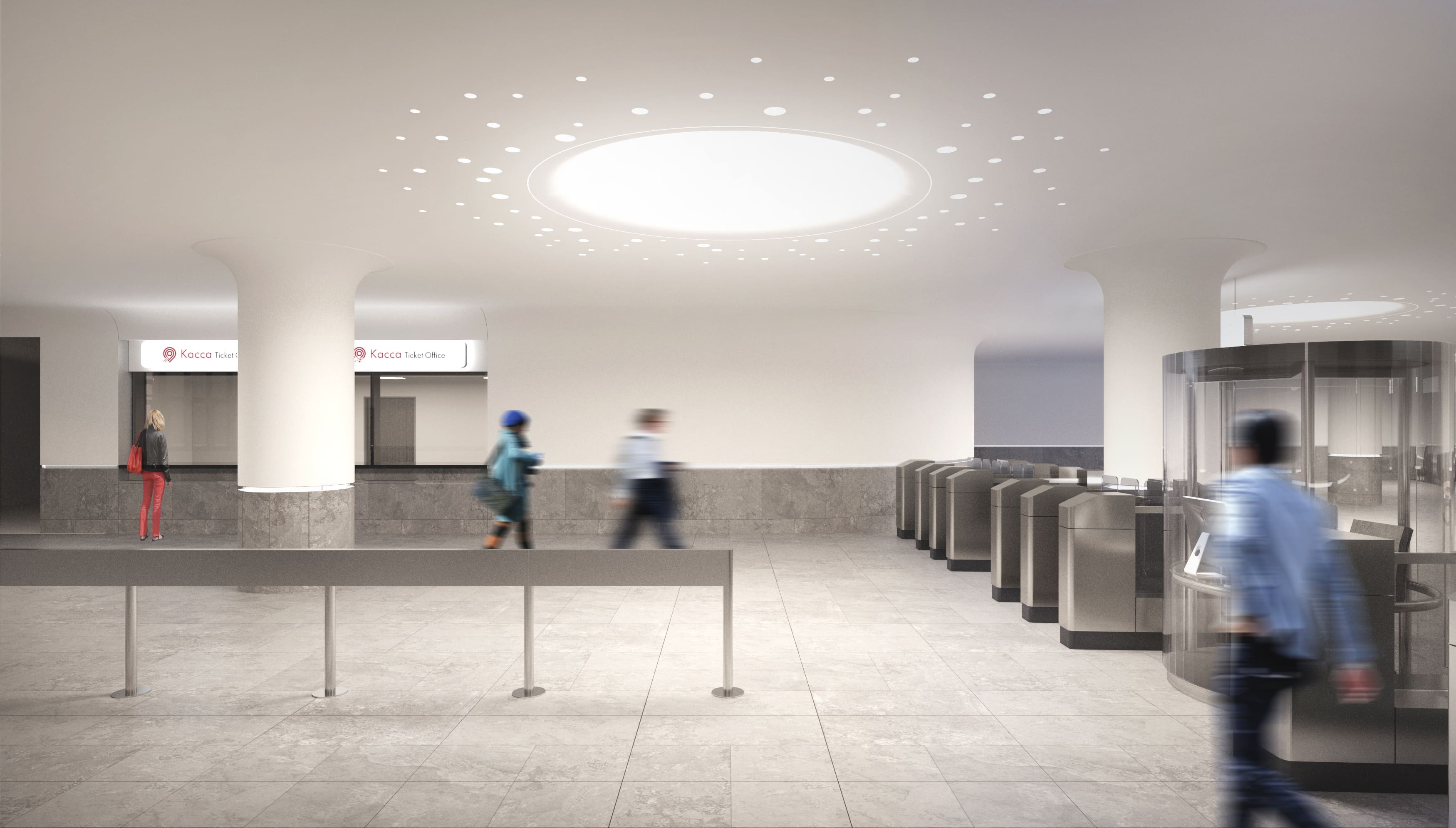 The architecture of the main lobby is inspired by the circular subway lobbies of the 20th century.
