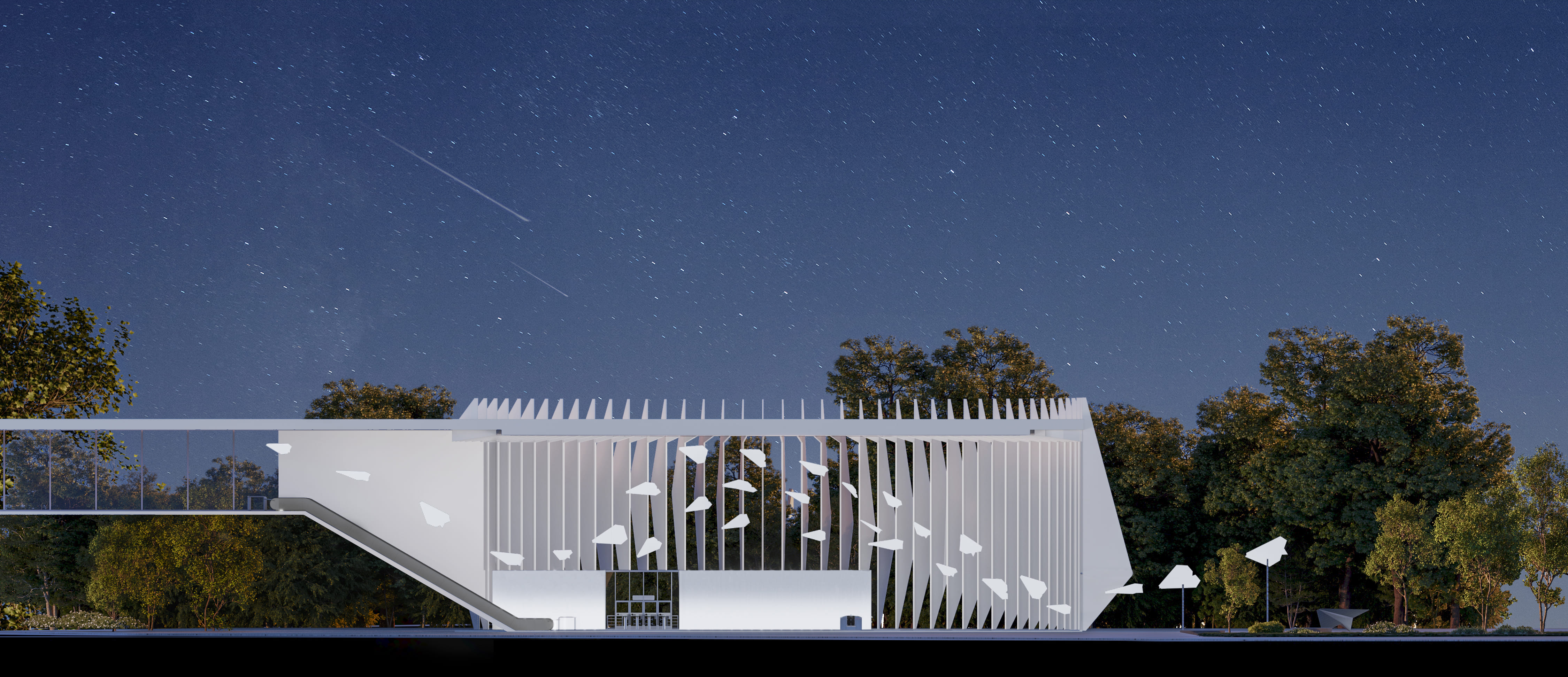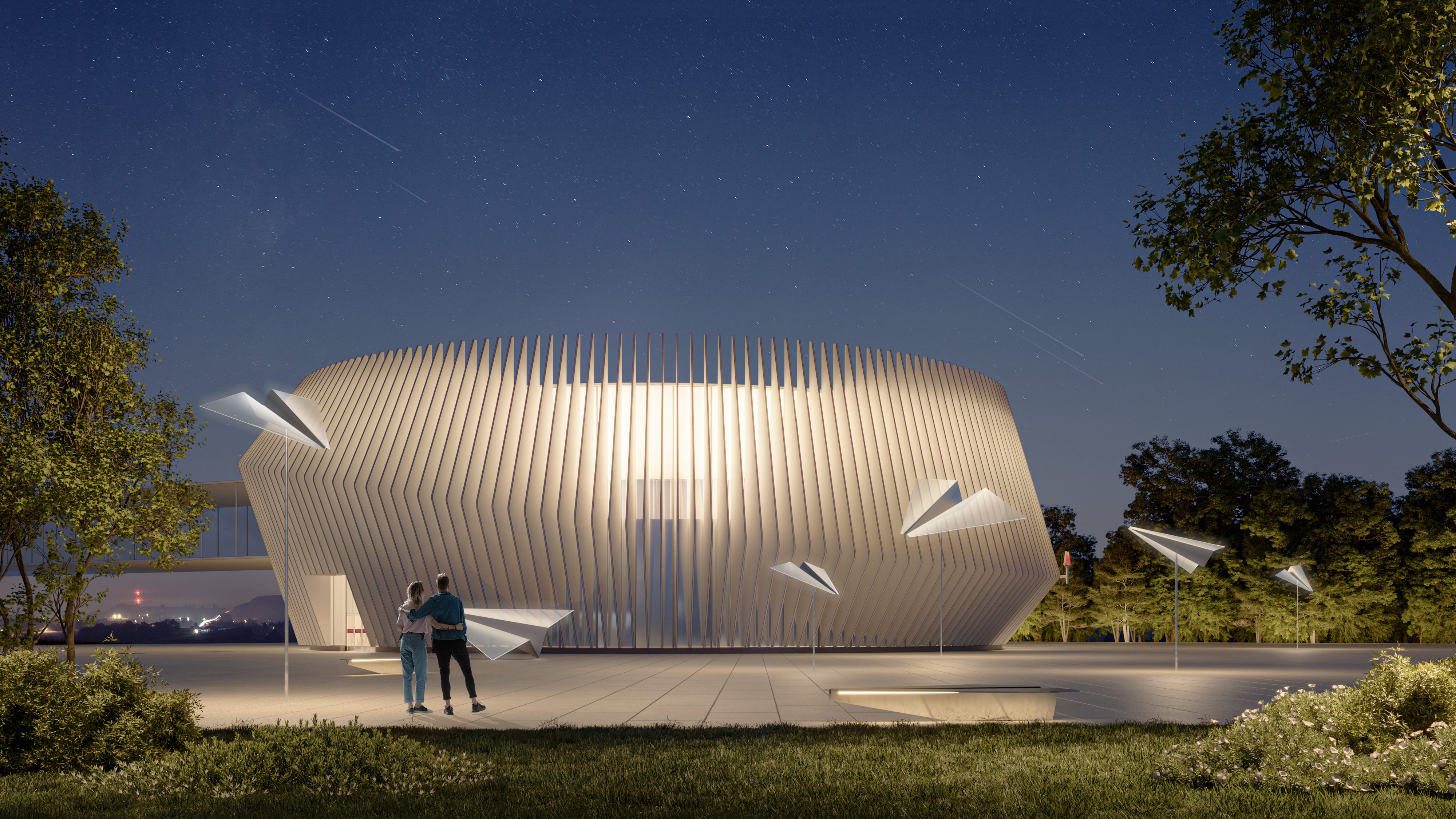 Developing the idea of paper plasticity, the shape of the pavilion is assembled like origami from metal lamellas. This architectural technique forms both the facade and the interior at the same time.
