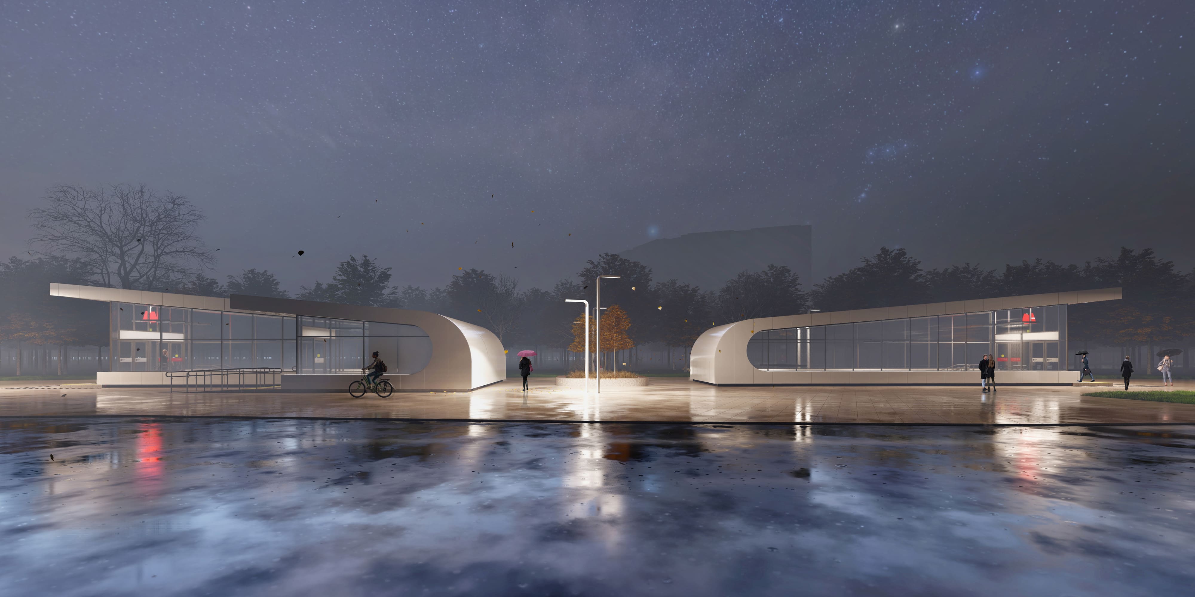 Ground pavilions are made in the form of glass volumes with one load-bearing wall passing from the ceiling vault.