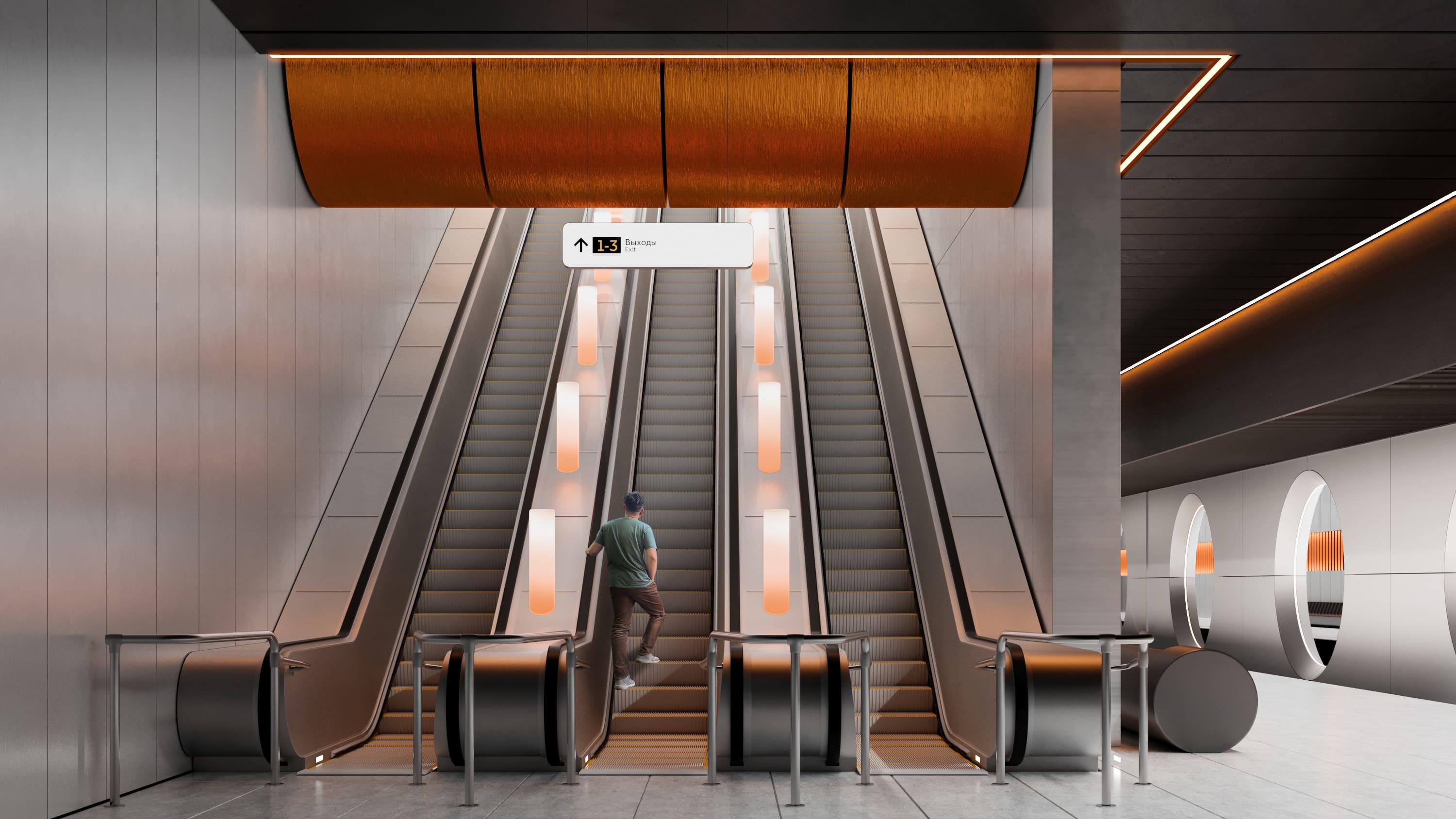 We turned the discovered “key” from a planar element into a three‐dimensional one and with its help created all the elements of the station ‐ the vestibule, with its outer and inner shells, escalator passages, and elements ‐ columns, lighting and furniture.